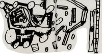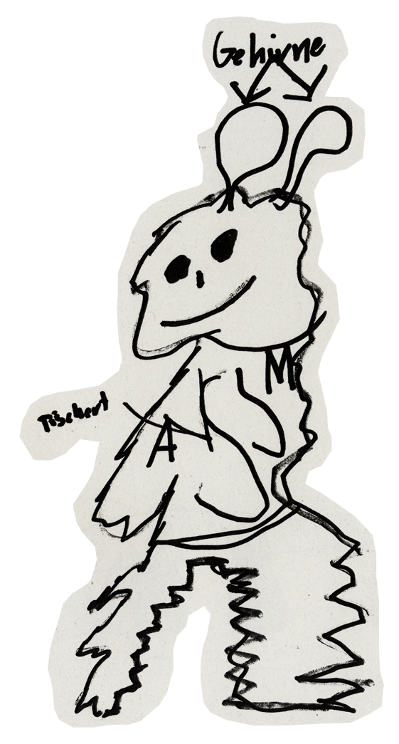 Er hat sich ein Forschungsbüro irgendwo zwischen den Stacheln aufgemacht und die Stachelspitzen als Dach genommenn, weil man die Stacheln belasten darf, aber beschädigen darf man sie nicht, also zum Beispiel keinen Nagel reinschlagen (siehe Plan). Das Büro ist eher eine Art Zelt, Schnüre sind zwischen den Stacheln gespannt und die noch bleibenden Löcher sind ausgefüllt mit Stoff und darunter hat er sich eingerichtet und vor seinem Häuschen hat er einen Forschungsgarten, wo auch eine Wetterstation ist. Er ist nämlich der Wetterologe des Stachelplaneten und macht die Wetteranalyse für den Stachelplaneten.