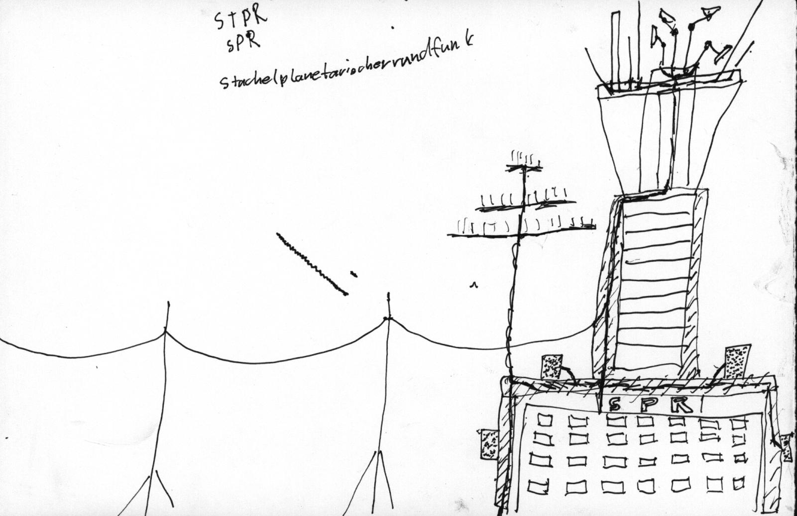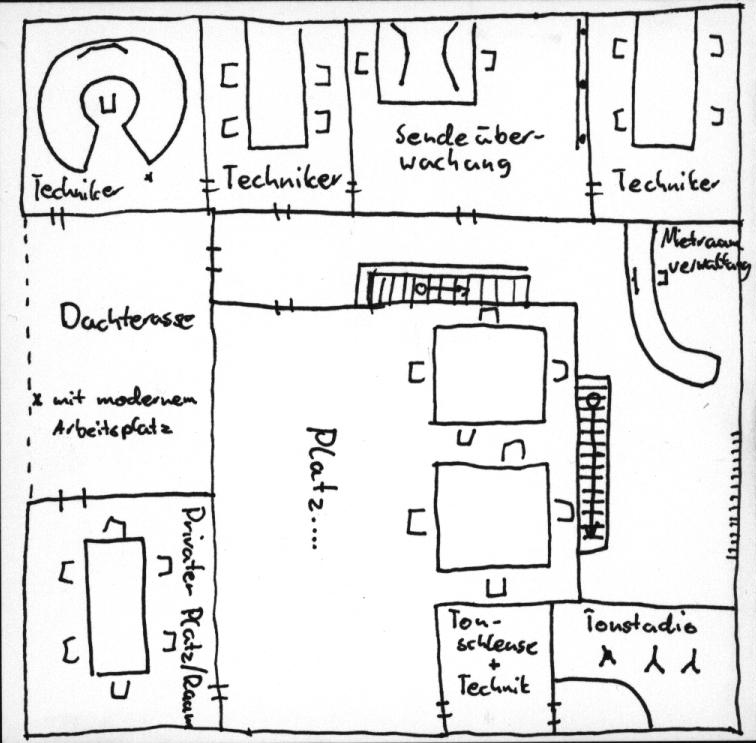 Der Rundfunk des Stachelplaneten muss natürlich in einem Gebäude untergebracht werden. Das Zentralstudio steht neben der Messe, um bei Veranstaltungen direkt vor Ort zu sein. Im Erdgeschoss befinden sich die Sutdios und ein Teil der Redaktion. Die anderen Mitarbeiter arbeiten in den lokalen Redaktionen im Dorf, Theater und in der Neustadt. Auf der Erde hat man kein eigenes Büro mehr, da die Sicherstellung der Sicherheit der Mitarbeiter nicht mehr gewährleistet werden konnte und die Miete unverhältnismäßig hoch war (zumindest für den Stachelplaneten). Mittlerweile teilt man sich auf der Erde ein kleines Büro mit Rundfunkanstalten anderer Planeten. Auf dem Stachelplaneten gibt es ein Fernsehstudio, sowie drei Radiostudios, jeweils mit Regie. Versorgt wird das Programm durch die drei Redaktionen. Auch die StR-Verwaltung sitzt im Erdgeschoss. Eine Etage darüber sind die Büro der Technik und Büros und Räume für Leute, die gerne Radio machen wollen oder irgendetwas recherchieren möchten. Dafür gibt es auch ein kleines Tonstudio. In der dritten Etage befinden sich die technischen Anlagen, die alle vom Institut des Sprachenschlauen (mit)entwickelt wurden. Auf dem Dach steht ein Turm, auf dem wiederum die Sendeanlagen untergebracht sind, um die Sender des StR über den halben Planeten zu verbreiten, da die Funkwellen den Planeten leider nicht durchdringen können.