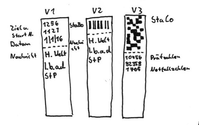 Die Papierstreifen werden auf Rollen gelagert und sind in vielen Geschäften erhältlich. Der Briefkopf, der Auskunft über Empfänger und Absender, sowie Datum gibt, ist mittlerweile in der dritten Version. Von anfänglich nur Zahlen, über einen StaBo (auf der Erde: Barcode), bis zu einem StaCo (auf der Erde: QR-Code), der sogar schon die Nachricht selbst enthalten kann.